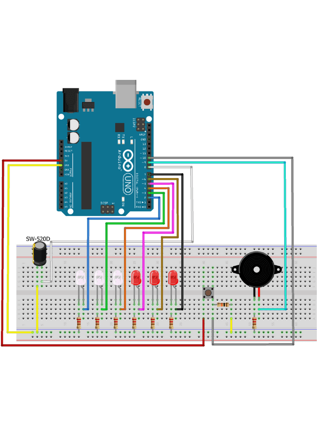 Bu projede SW-520D titreşim sensörü kullanarak basit bir deprem uyarı sistemi yapımını inceleyeceğiz. Sistemde titreşim yokken beyaz LED’ler yanacak, titreşim olduğunda ise kırmızı LED’ler yanıp sönerken buzzer ötüp susacaktır. Titreşim algılandıktan sonra butona basılması suretiyle sistemin normal haline döndüğünün gözlenmesiyle proje tamamlanacaktır.